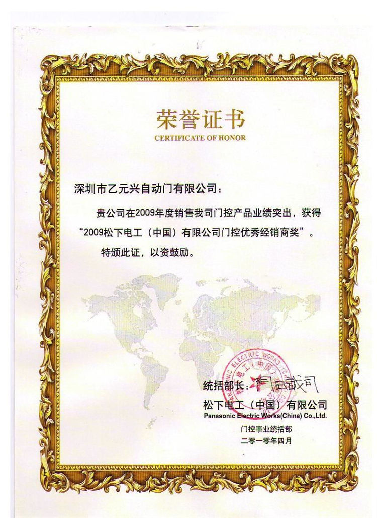 • 松下自動門經(jīng)銷商證書